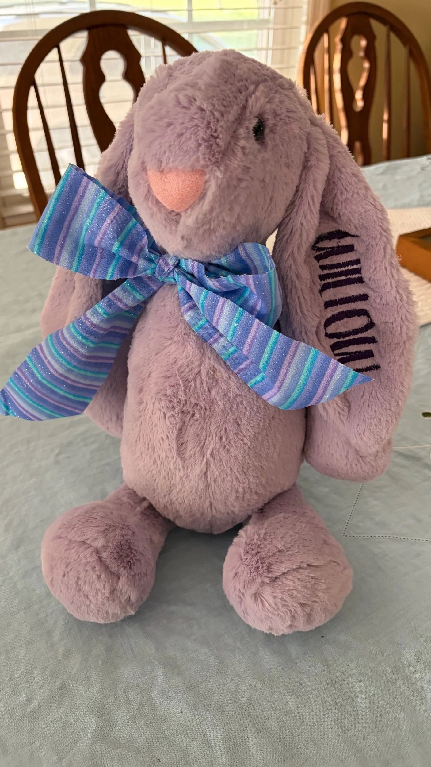 Shop › Easter Bunny Image 1 of 1 Easter Bunny $18.00 Easter Bunny with name embroidered on ear Color: Cream Purple Blue White Add To Cart Added! Easter Bunny with name embroidered on ear
